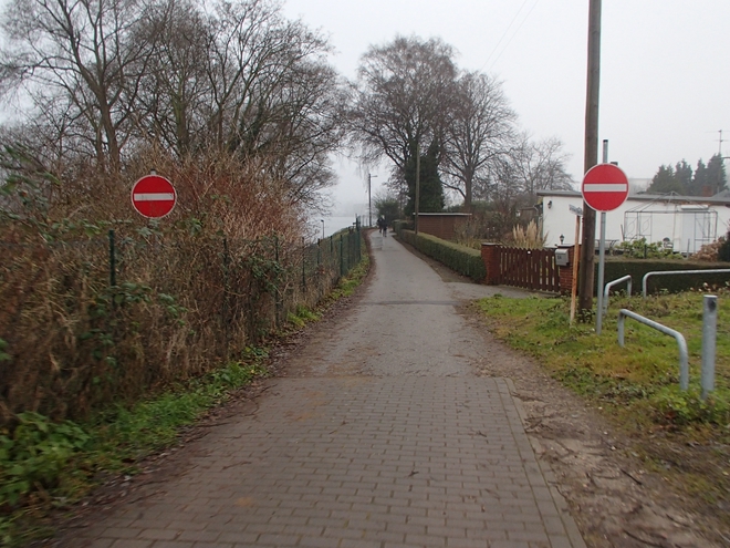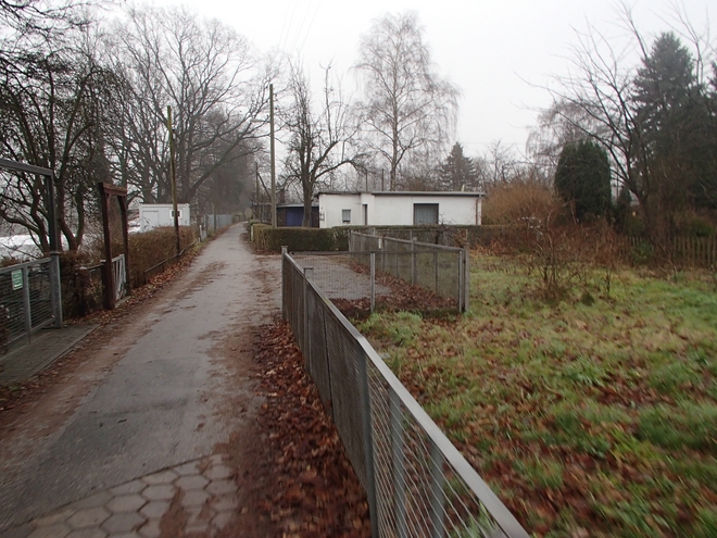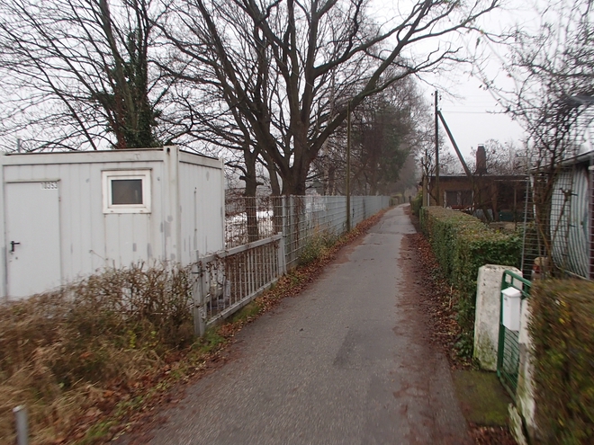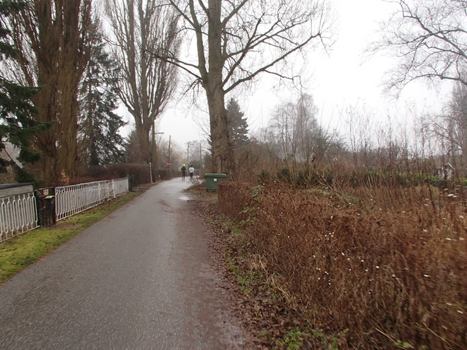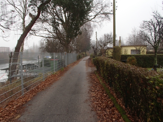 Runde 1 10.16 Uhr / Km 1,6 Rechts die Schrebergärten und Parzellen, links die Bille oder hier der Bullenhuder Kanal. Gelaufen wurde entgegen der Einbahnstraße. Das Tempo-Limit von 10 Km/h durfte von uns Läufern ignoriert werden. |