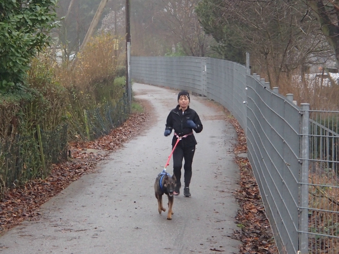 Runde 5 11.11 Uhr / Km 10,1 Plan B, sich vom Hund über die Strecke ziehen lassen? Für mich und meine Canophobie dann lieber doch nicht. |
