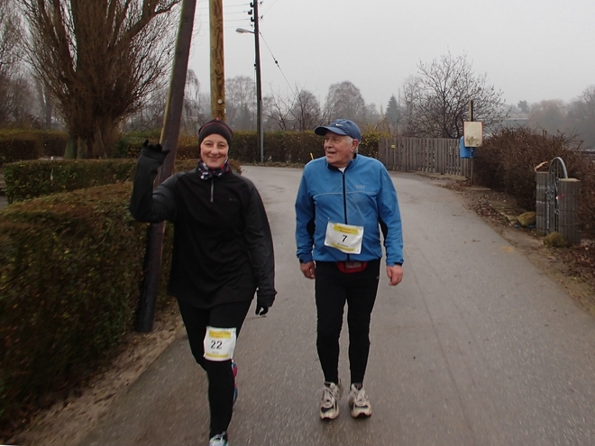 Runde 7 11.49 Uhr / Km 16,4 ... und eine Runde später fast an selber Stelle kamen die hier Marathon-Führenden Helmut (vorne) und Beate (dahinter in Rot). |