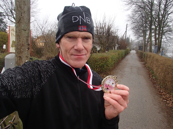 Runde 14 13.40 Uhr / Km 33,8 Entgegen Meldungen von vor dem Start, es gäbe dieses Mal keine Medaillen, gab es doch welche. Zur Beweissicherung und zur eigenen Motivation machte ich vier Runden vor Schluß mal schnell ein Foto. |