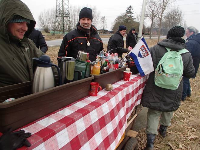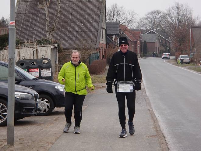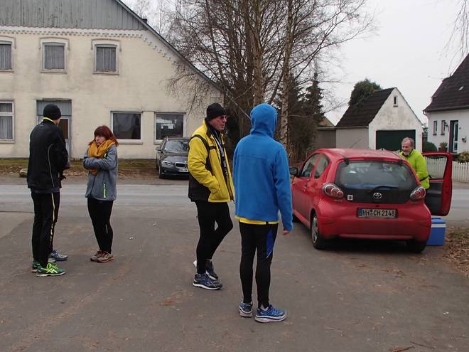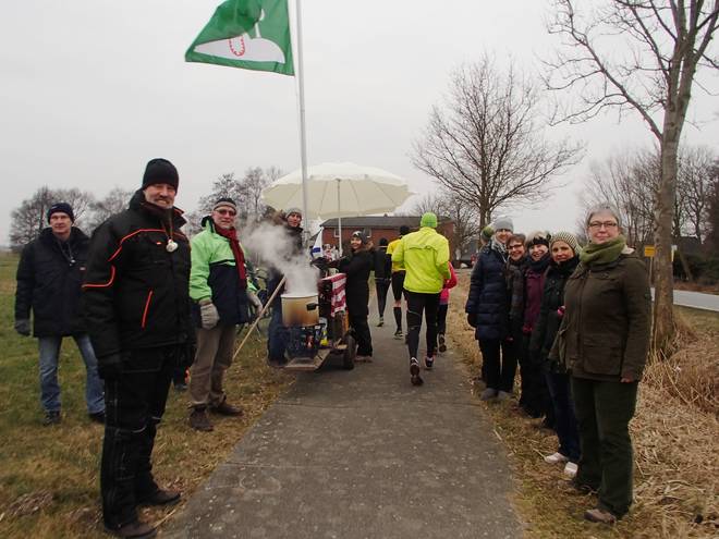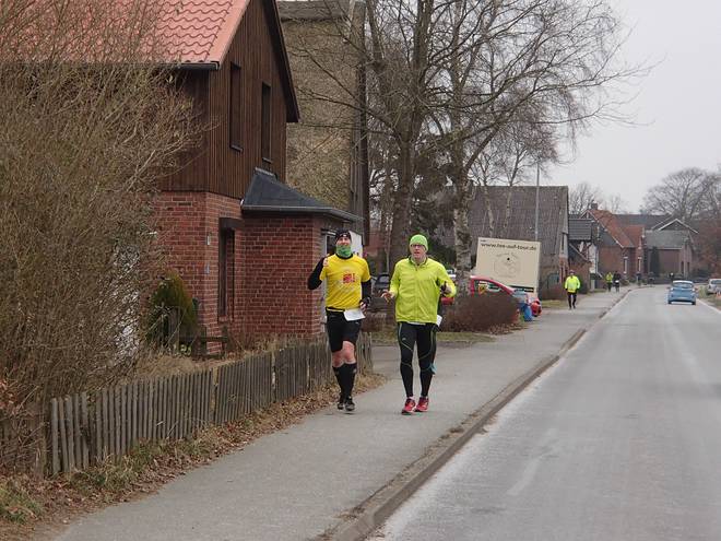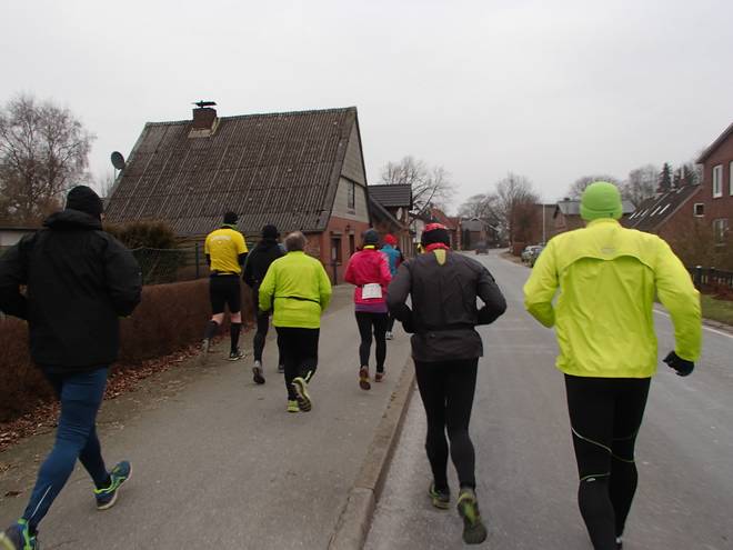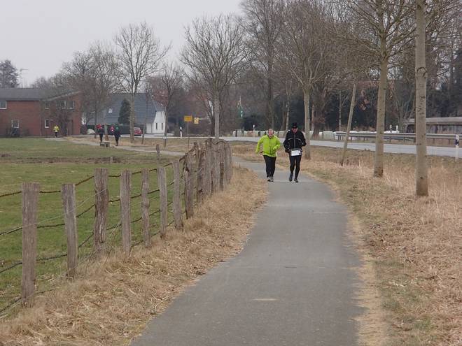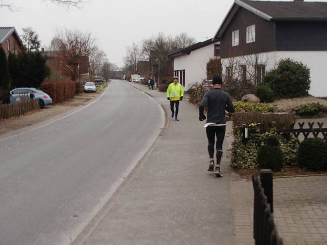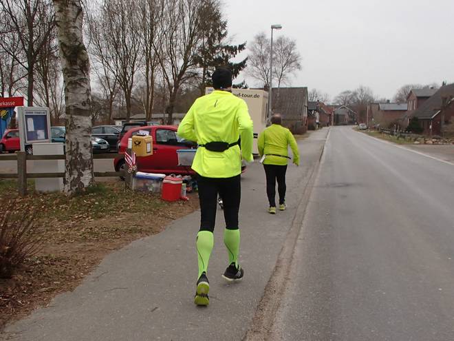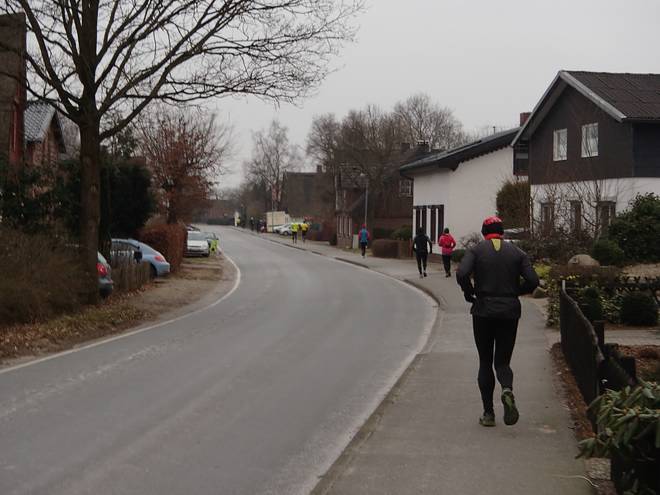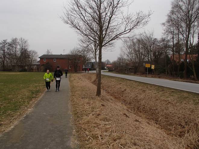 Runde 9 11.53 Uhr / Km 18,5 Die Boßler waren immer noch auf der Strecke. Sie machten aber Pause, wenn ein Läufer kam. Und die kamen häufig. Sie waren wohl froh, als sie sich nach Westen von der Strecke herunter geboßelt hatten. |