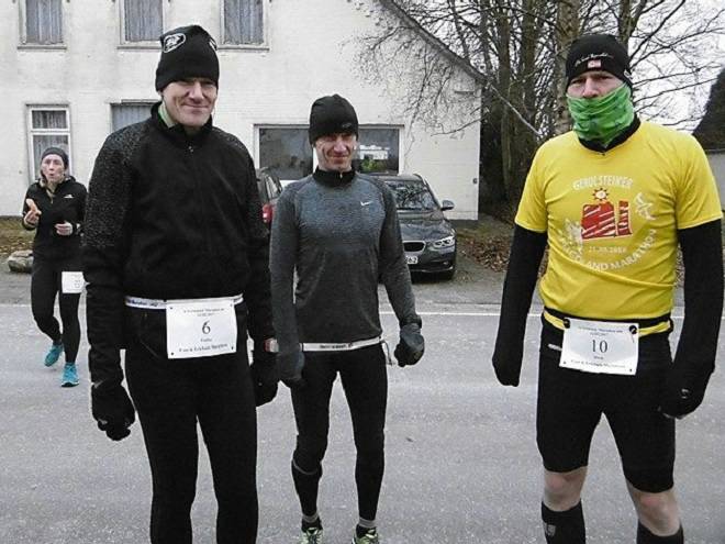 Grönland 9.56 Uhr Die ersten drei der Cup-Wertung: In der Mitte Thomas als Führender, rechts Dirk (Dritter) und links ich (Zweiter). Der Zweite und Vierte vom Sibirien-Marathon waren nicht dabei. Kränklich wie ich war konnte ich meine 3:21 Minuten Vorsprung vor Dirk nicht verteidigen. Zu Platz Vier (Rico) hatte ich 59:52 Minuten Vorsprung. Thomas lief sowieso in einer eigenen Liga und würde sicher gewinnen. (Foto: Christian) |
