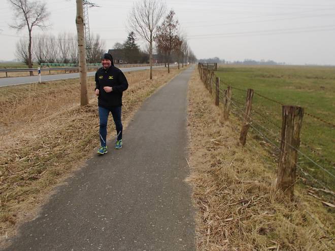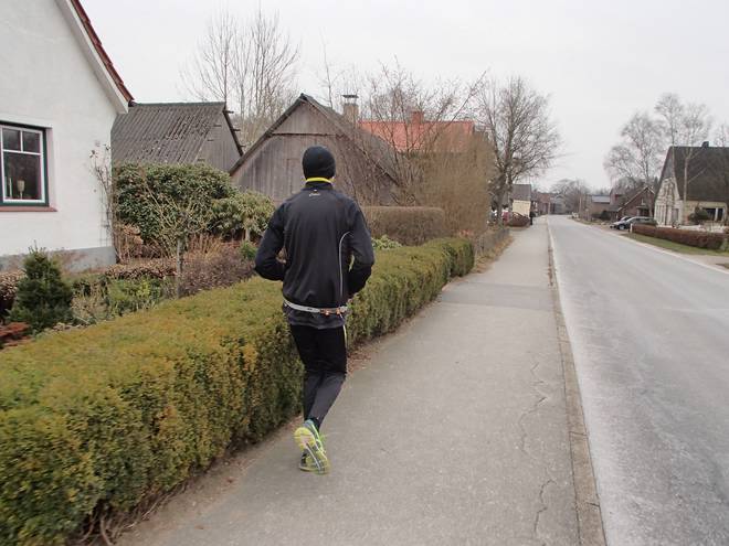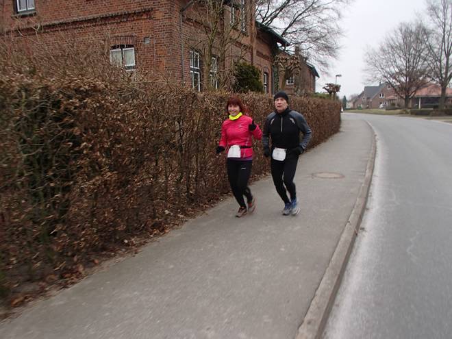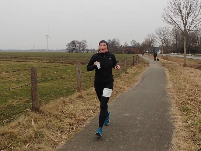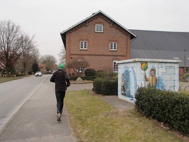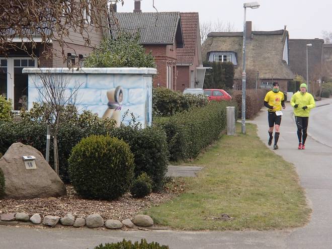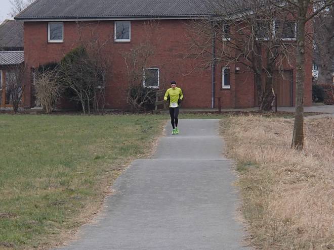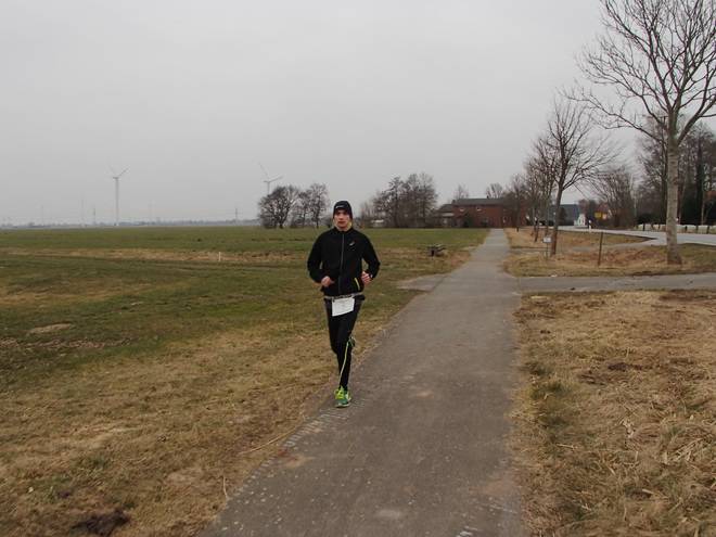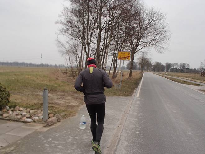 Runde 7 11.26 Uhr / Km 14,4 Der Ostwind war schon recht störend. Es war ein spürbarer Unterschied, ob man wie ich hier gegen den Wind lief oder mit. Vor allem war es kalt. |
