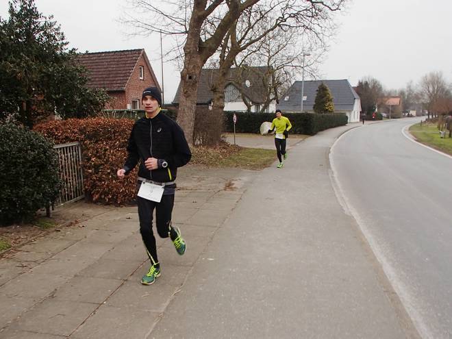 Runde 13 12.45 Uhr / Km 27,3 Ein seltenes Foto. Der Zweite (Rico) läuft vor dem Führenden (Erik). Naja. Erik hatte fast eine Runde Vorsprung. |