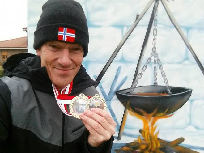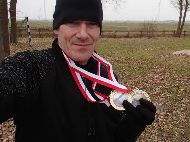 Finish 14.21 Uhr / Km 42,195 Zwei Medaillen. Juhu. Die Eine für das Finish beim Grönland-Marathon und die Andere für das Finish beim Sibirien-Grönland-Cup. Die Cup-Auswertung kam erst später. Darum hatte ich hier auch noch keinen Pokal. |