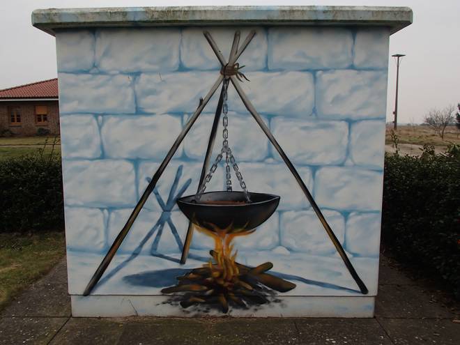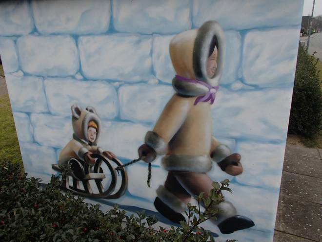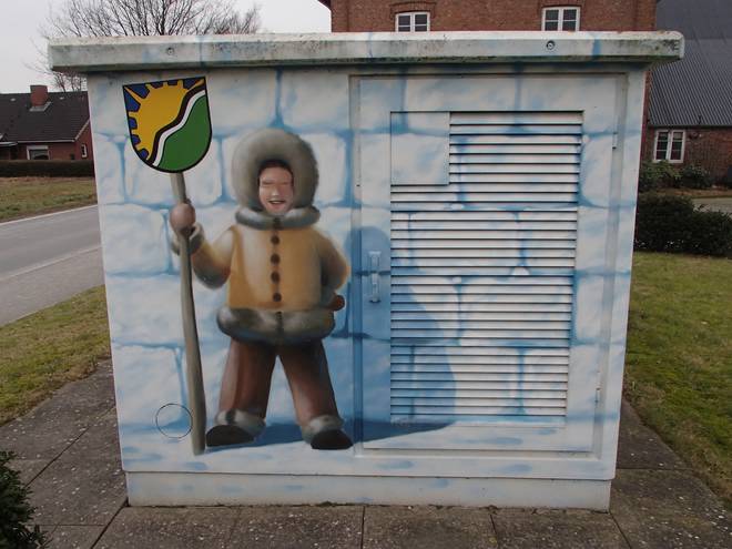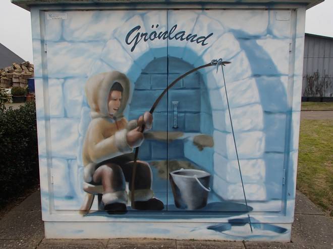 Grönland 14.46 Uhr Nach dem Umziehen in der Feuerwehrwache machte ich mich noch auf zu den hübschen Bildern auf dem Stromkasten. |
