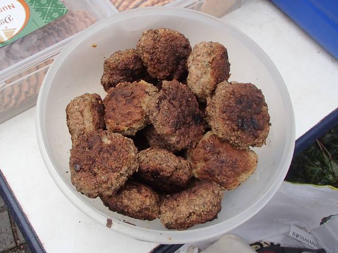 Volksdorfer Teichwiesen 9.10 Uhr Und meine Kollegin Sibylle hatte 20 ihrer berühmten Bratklopse beigesteuert. Ich wollte eigentlich noch ein paar Donuts und andere Leckereien mitbringen, aber nur weil am Dammtor-Bahnhof die Läden um 7.00 Uhr öffnen sollen, heißt das ja nicht, daß da irgendwas um 7.30 Uhr offen ist (außer McDonalds, dem Zeitschriftenladen und der Toiletten). |