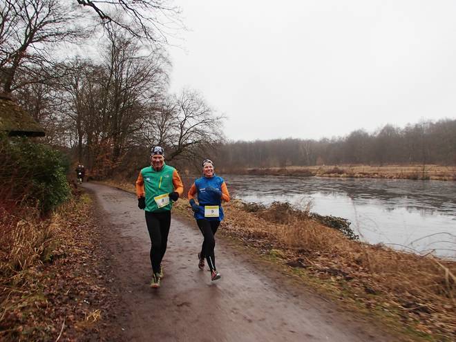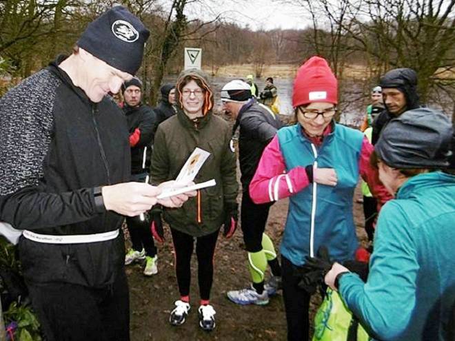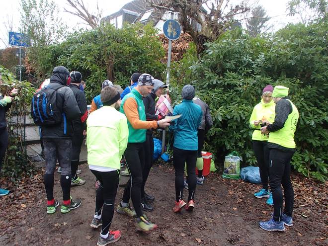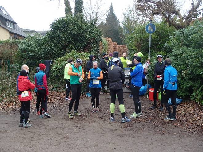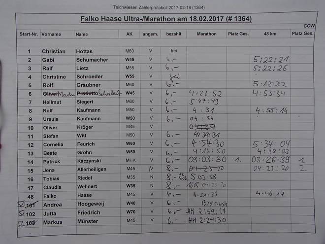 Volksdorfer Teichwiesen 16.02 Uhr Inzwischen war die Meldeliste fast voll. Drei finishten den Halbmarathon, fünf beließen es beim Marathon und zwölf finishten die ganze Distanz. |