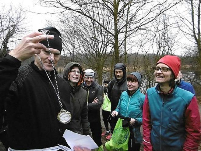 an den Teichwiesen schon mit Startnummern, bekommt am Ende Medaillen und