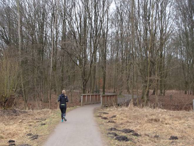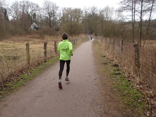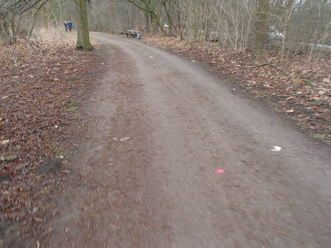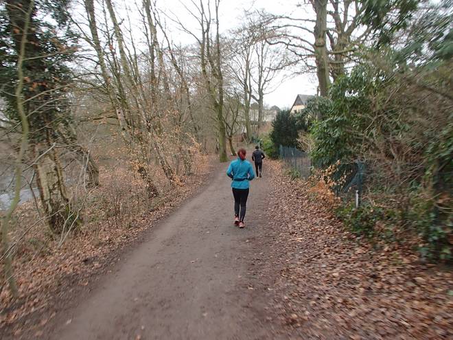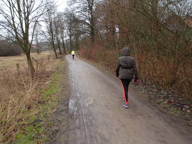 Runde 1 9.32 Uhr / Km 1,7 Eigentlich kann man sich an den Teichwiesen gar nicht verlaufen. Unsere Gäste aus dem Sauerland, Ursula und Rolf, liefen dennoch zunächst eine Weile hinter mir her. Kann natürlich auch Zufall gewesen sein. |