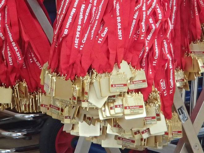 Stadtparkasse Cuxhaven Rohdestraße 17.38 Uhr Die Medaillen. Nachdem ich im Vorjahr im Ziel keine mehr bekommen hatte, ein neuralgisches Thema. Aber man versprach mir, daß es genug Medaillen für alle geben würde. Naja... das hätte man mir im Vorjahr wohl auch zugesagt. |