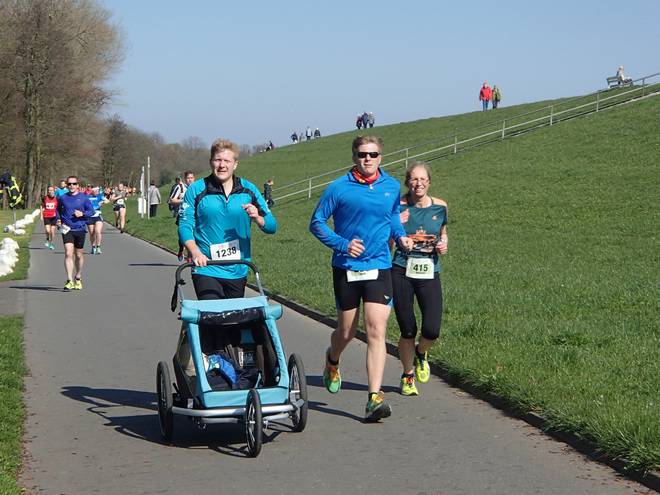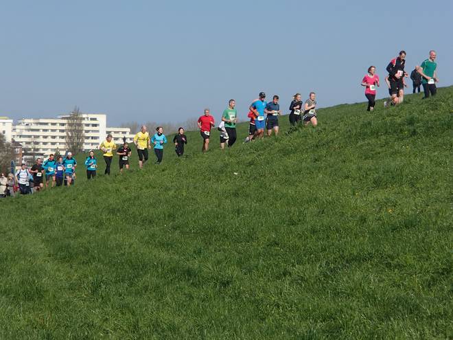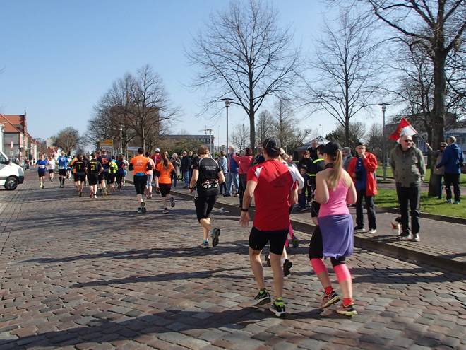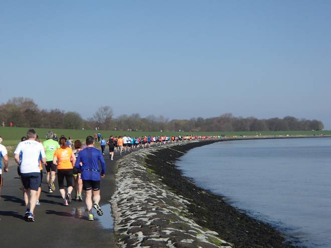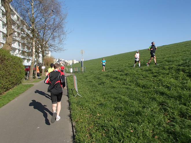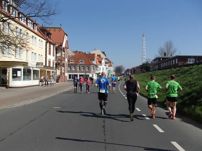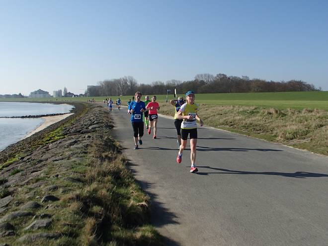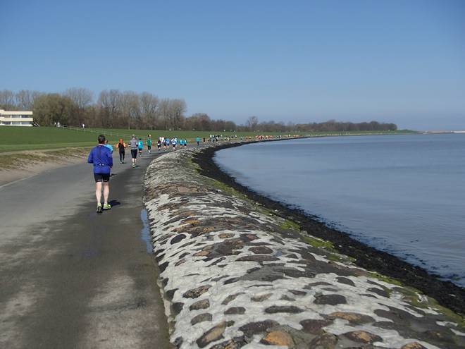 Deichstraße Runde 3 12.31 Uhr / Km 30,8 Hier kamen mir schon die Zehn-Kilometer-Läufer entgegen, die um 12.30 Uhr gestartet waren. Mit 468 Startern das größte Feld des Tages. |