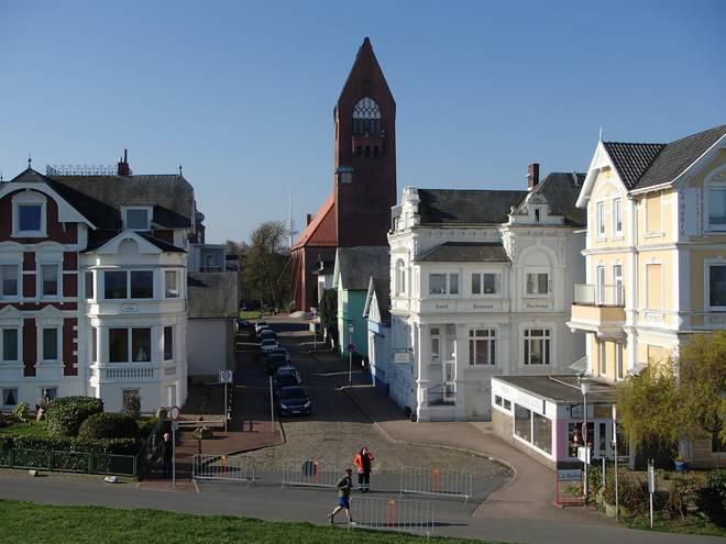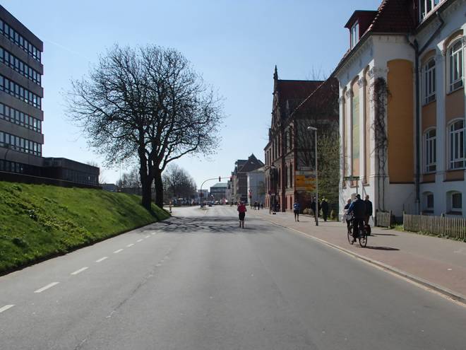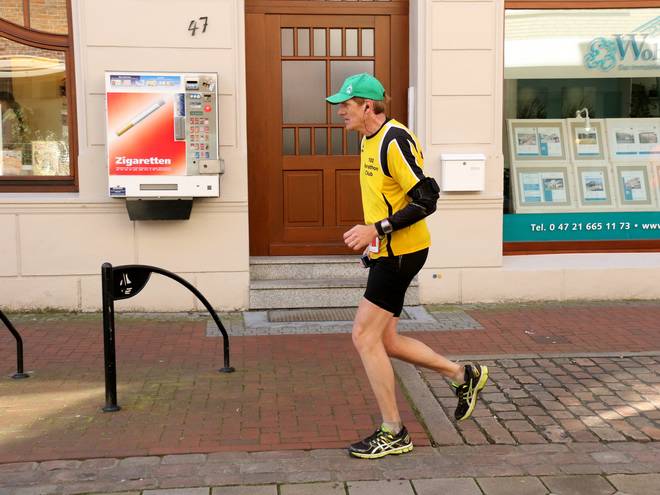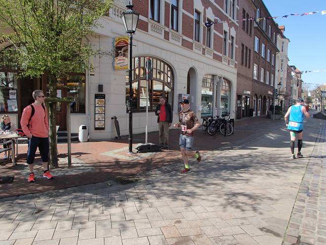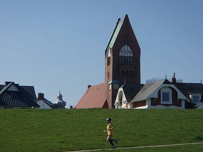 Deichstraße Grimmershörnbucht Runde 3 11.43 Uhr / Km 23,6 Und dann kam auch schon der erster Überrunder von hinten angerannt. Hier vor der Petri Kirche. Ich erinnerte mich an die Cuxhaven-Marathons, bei denen ich überhaupt nicht überrundet wurde. Und nun schon vor Kilometer 24. |