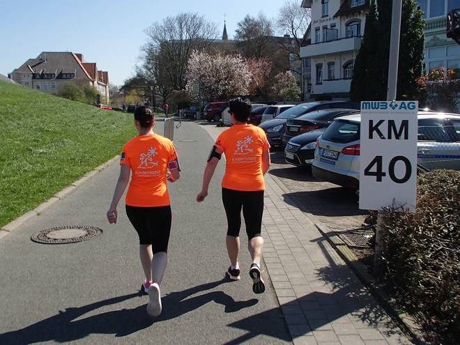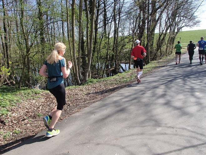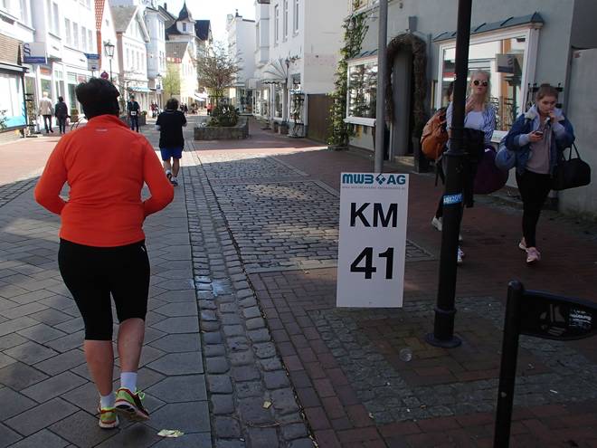 Deichstraße Runde 4 13.47 Uhr / Km 41,6 Das Fernduell mit der Spitze des Fünf-Kilometer-Feldes sah gut für mich aus. Es war zumindest noch keiner hinter mir zu sehen. Aber ich hatte auch noch um die 600 Meter zu laufen. |