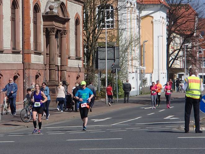 Kaemmererplatz Runde 1 10.30 Uhr / Km 10,53 Nachdem ich auch die 250 Meter-Schleife an den Sparkasse vorbei gelaufen war, startete das Feld der Halbmarathon-Läufer. Obwohl es da links eine Gasse gab, sollten wir Marathon-Läufer warten. |