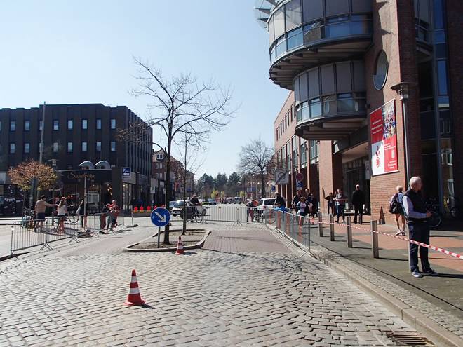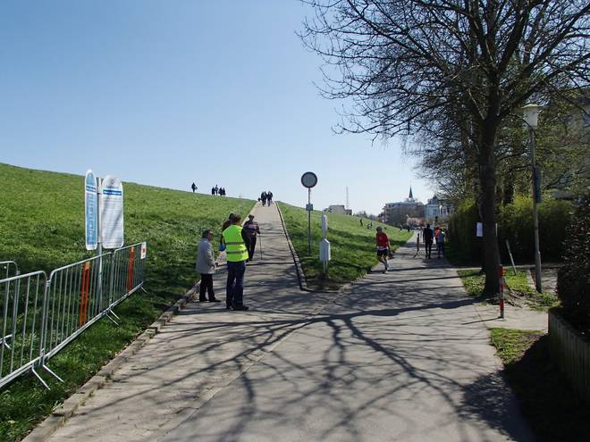 Deichstraße Runde 2 10.32 Uhr / Km 10,6 Knapp anderthalb Minuten verwartete ich, ehe ich nun am Ende des Halbmarathon-Feldes weiterlaufen durfte. |