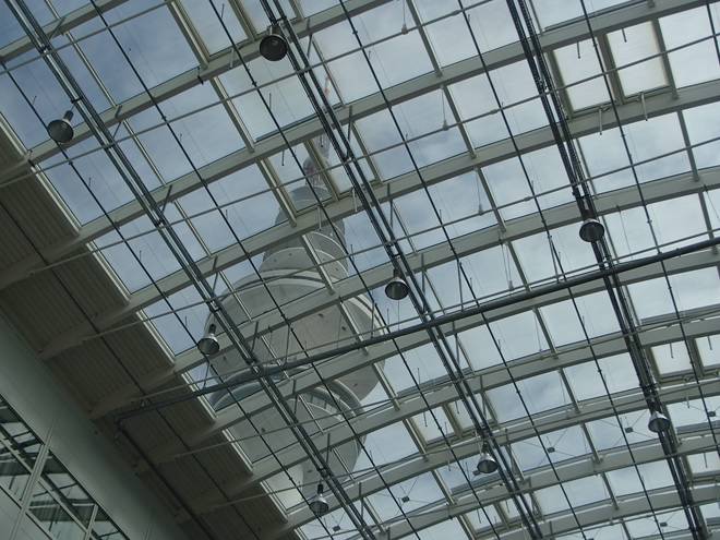 Hamburg Messe 12.31 Uhr Man könnte man nachzählen, zum wievielten Male die Marathon-Messe nun schon an einen anderen Ort umgezogen war. In Halle A1 waren wir jedenfalls noch nie zur Messe. (Blick durch das Hallendach auf den Heinrich-Hertz-Turm) |