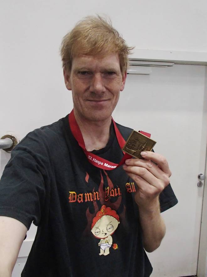 Hamburg Messe 12.58 Uhr Marathon-Medaille Nr. 213. Geschafft. 17 Jahre nach der ersten Medaille hat sich eine nette Sammlung ergeben. (Foto: Marathon-Photos) |