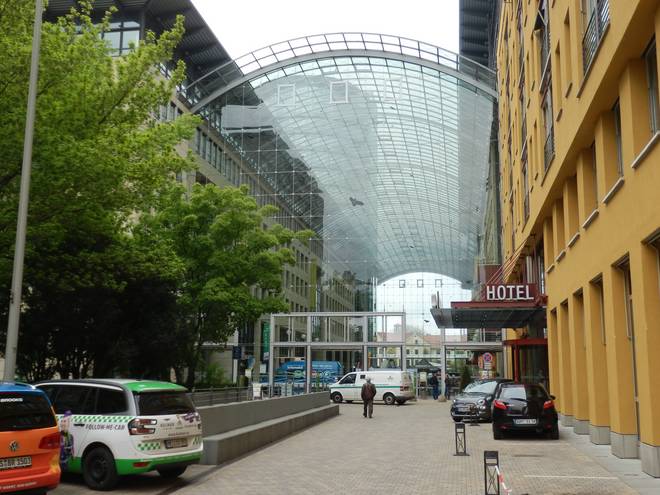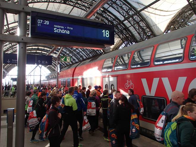 Dresden Hauptbahnhof 7.29 Uhr Das Hotel war nur 600 Meter vom Bahnhof entfernt. Da ich nach dem Lauf gleich nach Polen zum nächsten Marathon am Folgetag weiter reisen würde, mußte ich schon alles Gepäck mitnehmen. |
