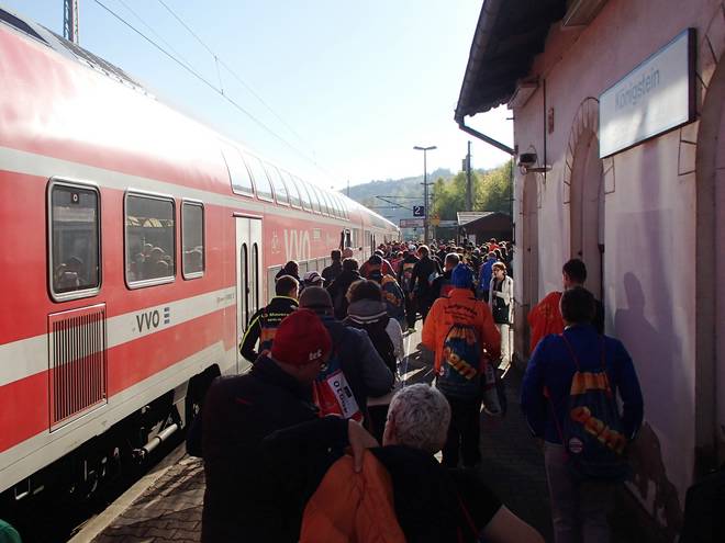 Bahnhof Königstein 8.12 Uhr Die Bahnfahrt im überfüllten Zug war mäßig. Immerhin fand ich noch einen Sitzplatz auf dem Fußboden. Dafür war die Fahrt gratis, bzw. im Startpreis mit enthalten. Tolles Aroma im Zug. Ein paar Hundert Läufer. Diese irre Mischung aus Schweiß und Cremes und sonst was, wenn die Sonne auf die Waggons knallt. Kein Wunder, daß kein Schaffner kam.. |