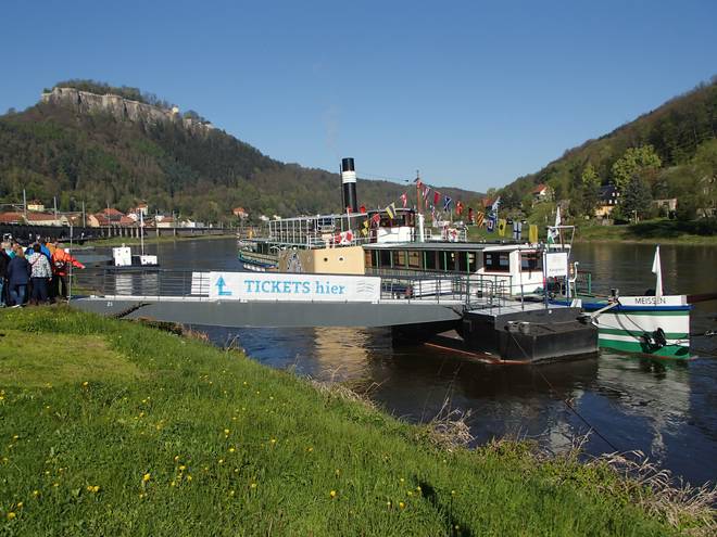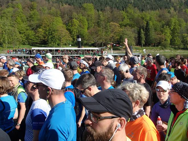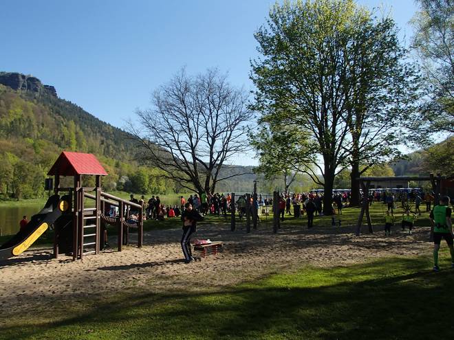 Elbstraße 9.25 Uhr Die krumme Startzeit ist dem Fahrplan der Bundesbahn geschuldet. Bei Rathen führt die Strecke zweimal über die Bahnschienen. Der Start erfolgt so, daß die Querung möglichst wenig Verspätung für die Züge bedeutet. |