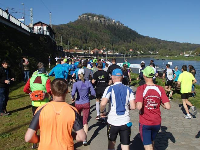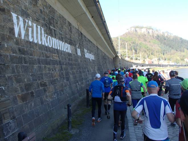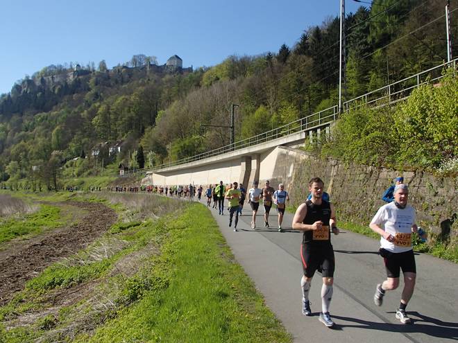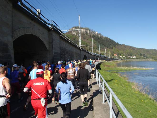 Elbweg Königstein 9.27 Uhr / Km 0,05 Mit Blick auf die Festung Königstein ging es dann los. 1129 Läufer auf dem 42,195 Kilometer langen Kurs von Königstein nach Dresden. |