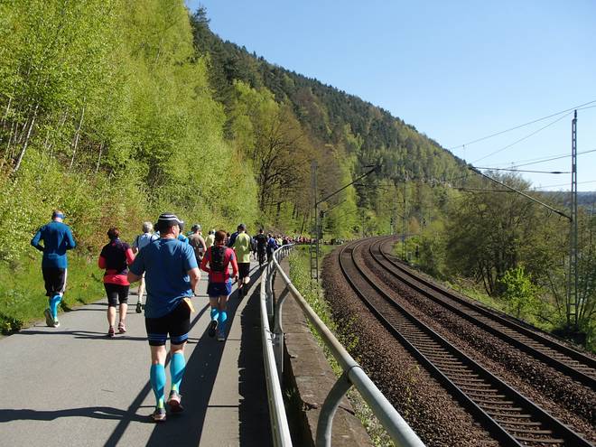 Elbweg Kurort Rathen 9.58 Uhr / Km 5,0 Bisher hatte ich mich mit der Zeit noch wenig beschäftigt. So um die 4:30 Stunden hatte ich eingeplant. Am Folgetag war ja schon der nächste Marathon. Außerdem rechnete ich hier mit vielen Fotos. |