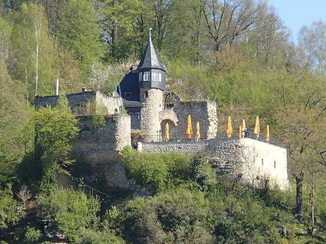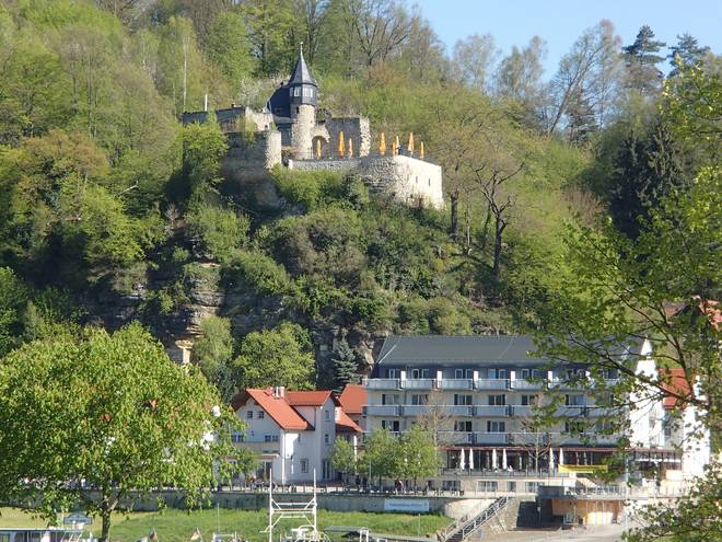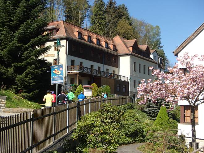 Pötzschaer Weg Kurort Rathen 10.09 Uhr / Km 6,5 Die Friedensburg. Ist auch eine Pension geworden. Also wer mal in einer Burg übernachten will, der hat hier die Auswahl. |