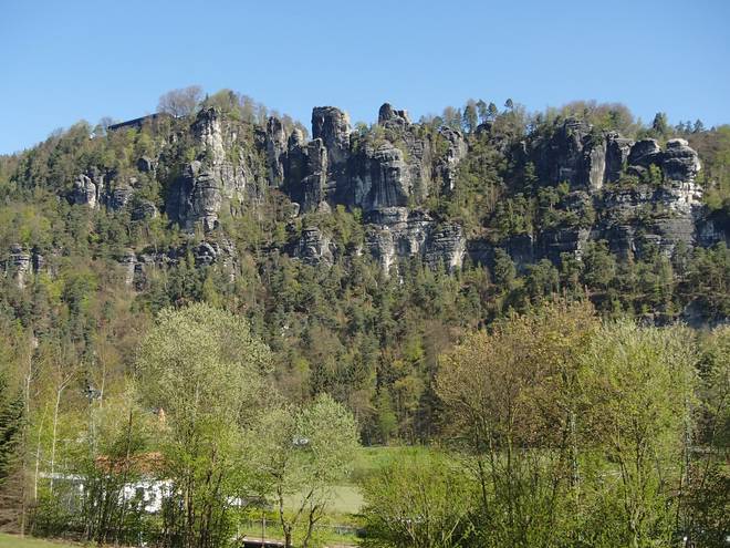Pötzschaer Weg Kurort Rathen 10.08 Uhr / Km 6,4 Nach ein paar Höhenmetern öffnete sich ein prächtiger Blick auf das Elbsandsteingebirge. |