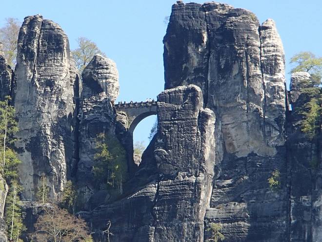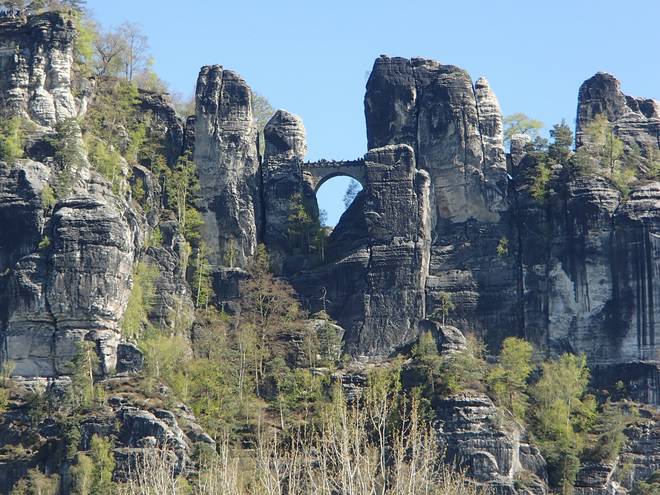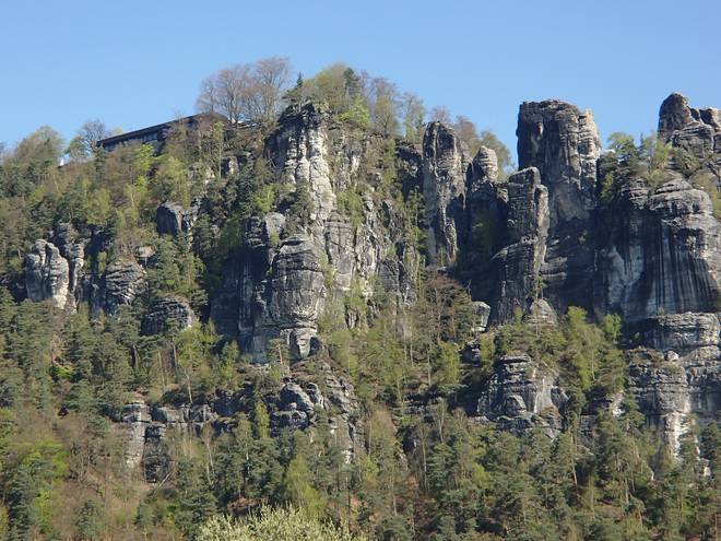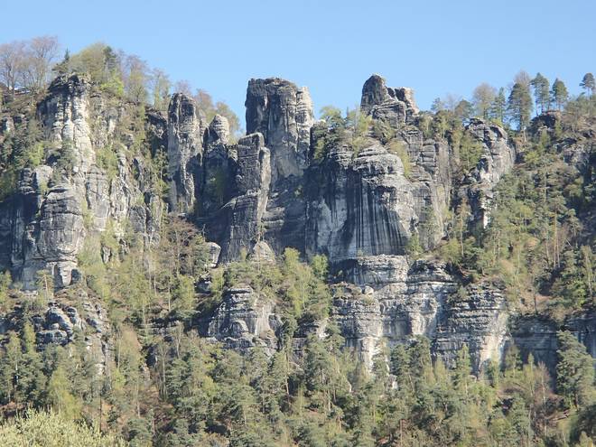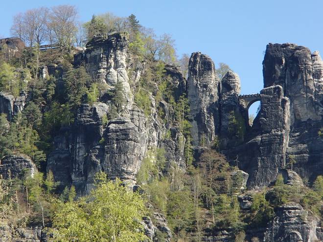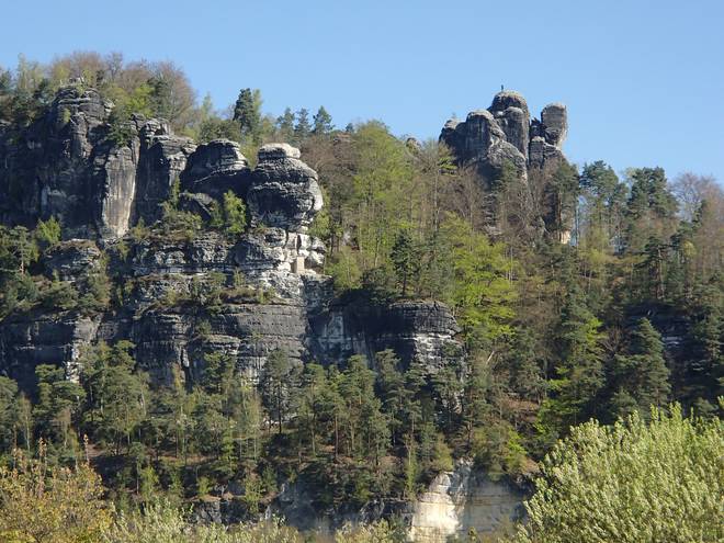 Pötzschaer Weg Kurort Rathen 10.10 Uhr / Km 6,8 Ich hatte allerdings wieder nun den Blick für die Bastei-Brücke und das Elbsandsteingebirge drum herum. |