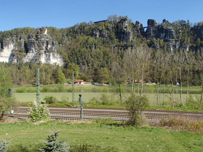 Elbweg Kurort Rathen 10.02 Uhr / Km 5,6 Das Elbsandsteingebirge mit dem Basteigebiet kam immer besser in Sichtweite. Ich war schon am Vortag hier gewesen und hatte das Gebiet bewandert. Aber da war es nicht ganz so sonnig gewesen. |
