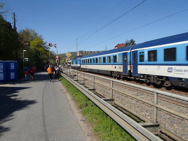 Obervogelgesanger Weg Stadt Wehlen / Pötzscha 10.28 Uhr / Km 9,6 ... und einmal ohne Zug. Wenn nun schon wieder Züge fuhren, hatten auch die letzten Läufer den Bahnhof Kurort Rathen passiert. Für die Zeit des Durchlaufes war die Bahn-Linie nämlich gesperrt. |