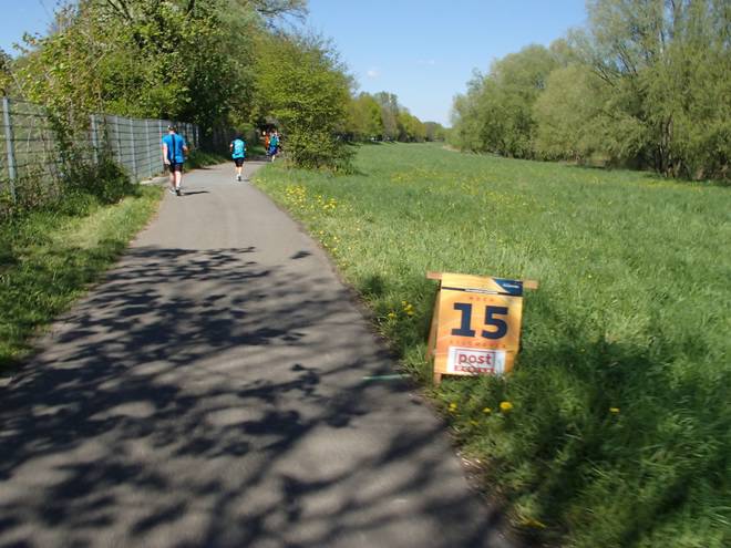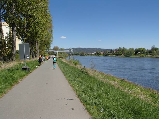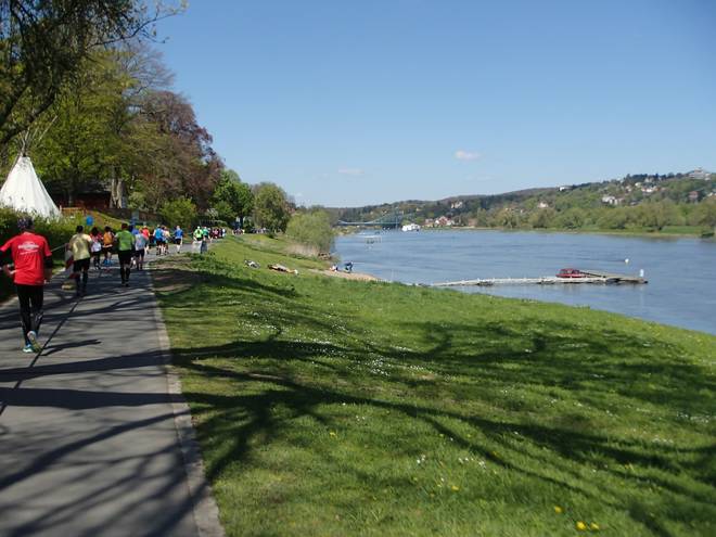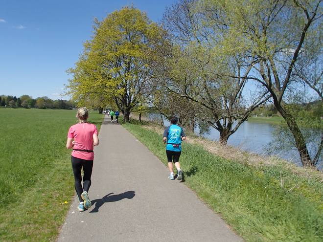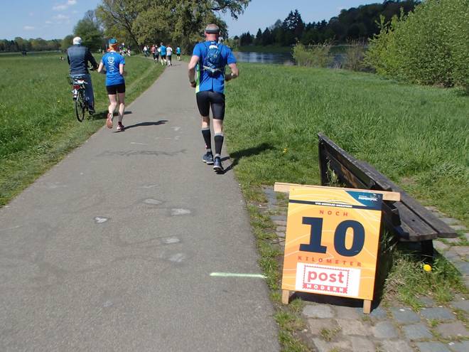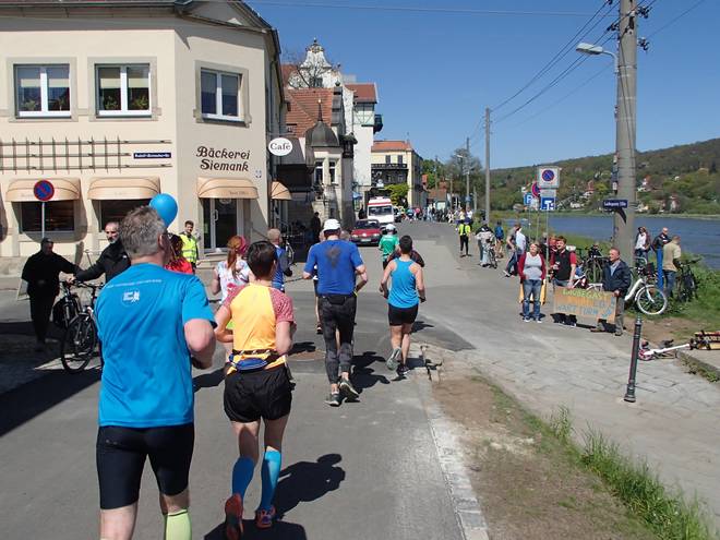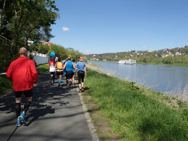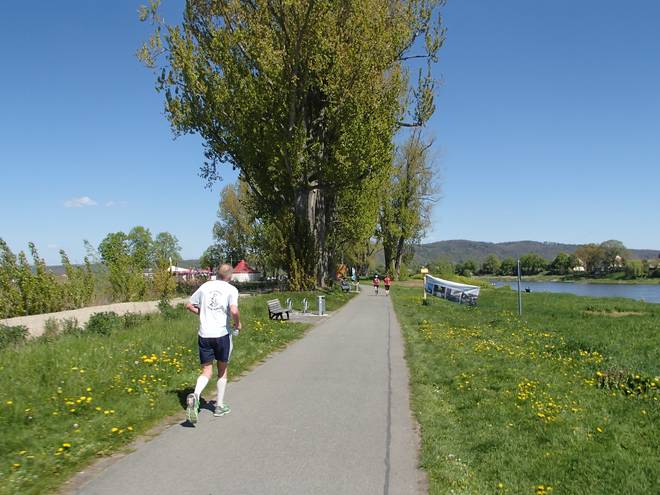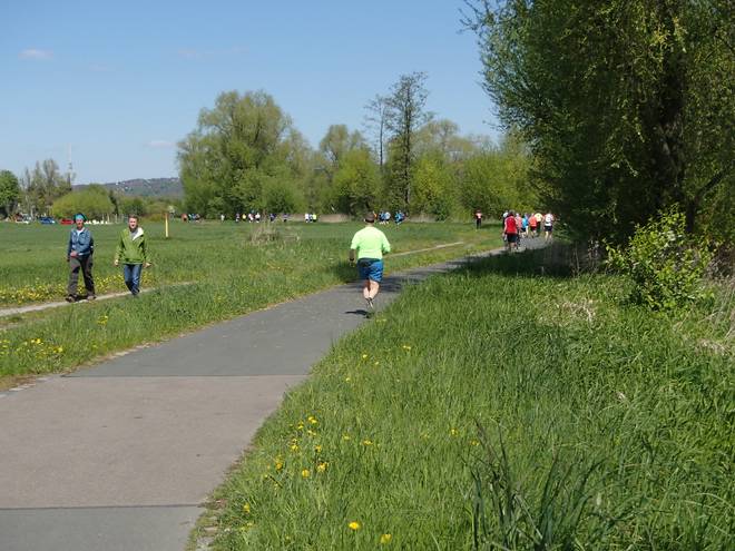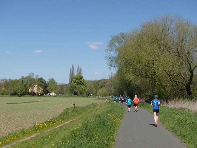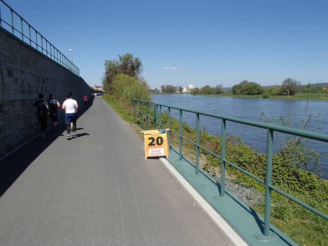 Elberadweg 13.05 Uhr / Km 34,9 Hier startete um 9.10 Uhr der Zehn-Kilometer-Lauf. Der macht auf dem Weg ins mit dem Marathon identische Ziel aber einen Umweg. |