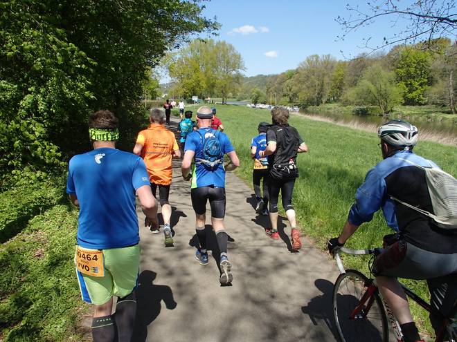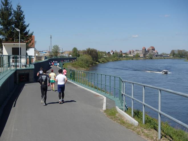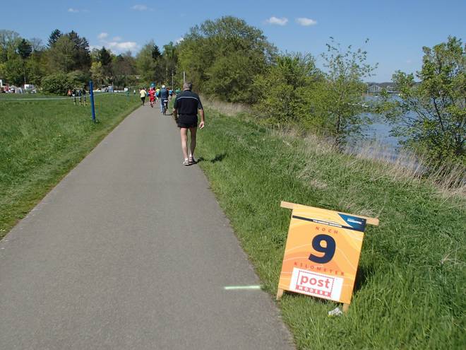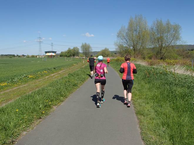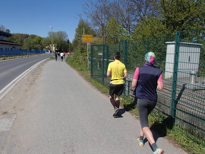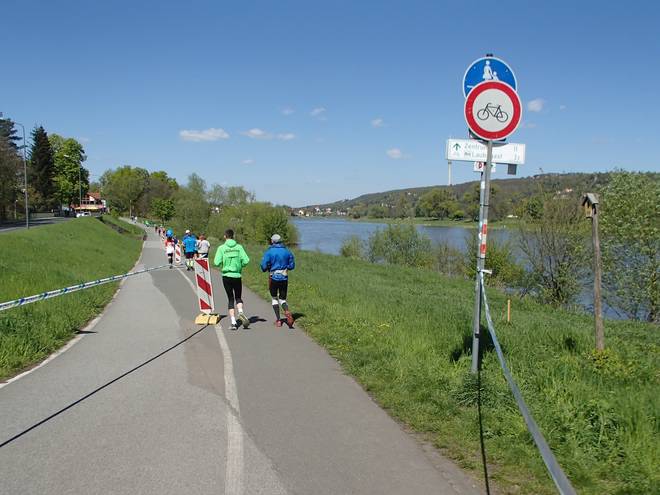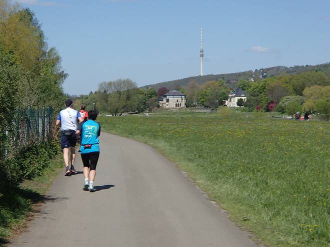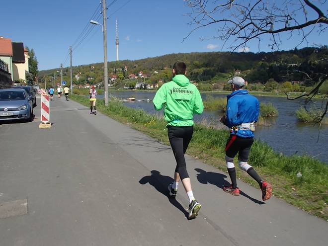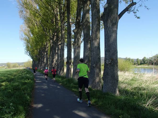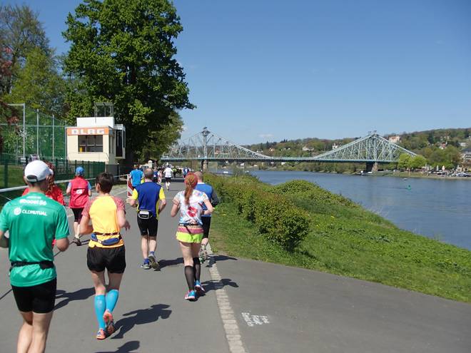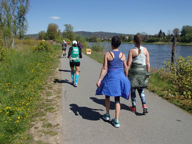 Elberadweg 13.05 Uhr / Km 34,9 Hier startete um 9.10 Uhr der Zehn-Kilometer-Lauf. Der macht auf dem Weg ins mit dem Marathon identische Ziel aber einen Umweg. |