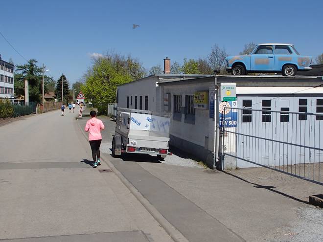 Tolkewitz/Laubegast 12.54 Uhr / Km 33,195 Fotopause, Pinkelpause, der 4:30-Stunden-Ballon wieder hundert Meter enteilt und doch kam das nächste Kilometer-Schild deutlich unter sechs Minuten. Vermutlich stimmte das was mit den Schildern nicht. |