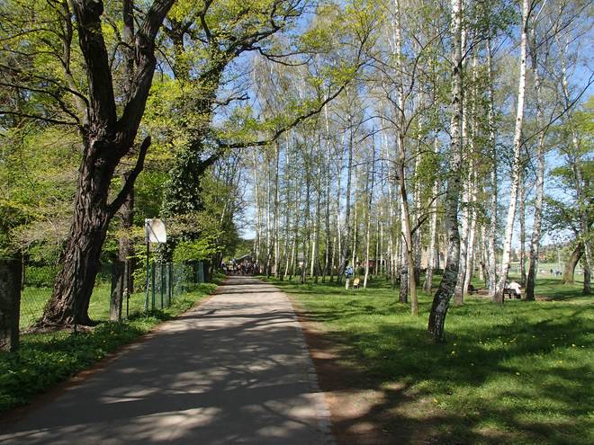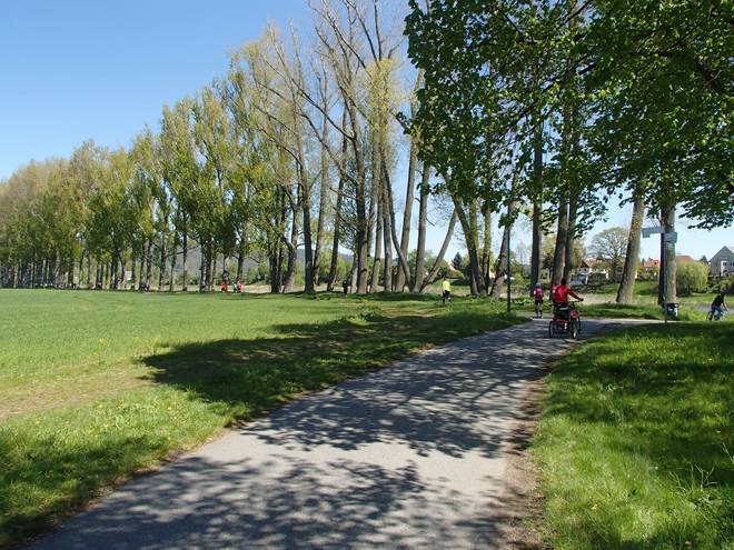 Elbradweg 12.03 Uhr / Km 24,9 So ein wenig Schatten war nicht verkehrt. In der Sonne war es doch spürbar warm, auch wenn es tatsächlich nur um die 15°C gewesen sein mögen. Irgendwo während dieser Baumreihe begann offiziell Dresdens Stadtgebiet. Gab aber kein Schild. |