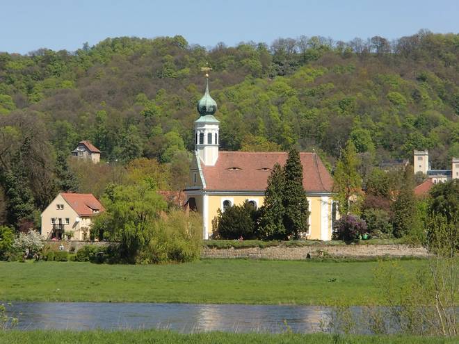Kleinzschachwitzer Ufer 12.28 Uhr / Km 29,2 Die hübsche Kirche Maria am Wasser steht ebenfalls auf der anderen Elbseite, aber nicht weit weg vom Schloß Pillnitz. |