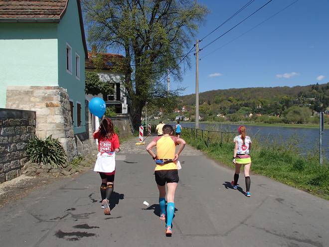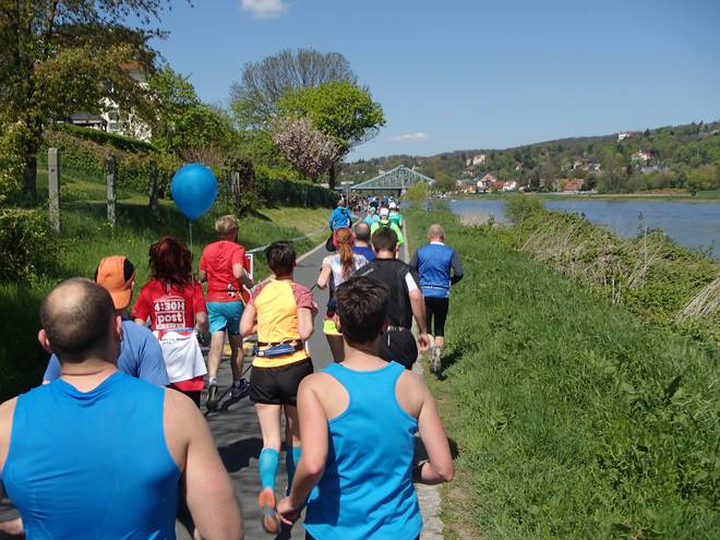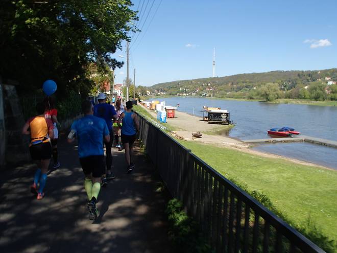 Kleinzschachwitzer Ufer 12.32 Uhr / Km 29,8 Nicht weit voraus tauchte dann ein Ballon auf. 4:15? 4:30? Ich rechnete und rechnete und war doch eher auf Kurs Richtung 4:25 Stunden oder darunter. |