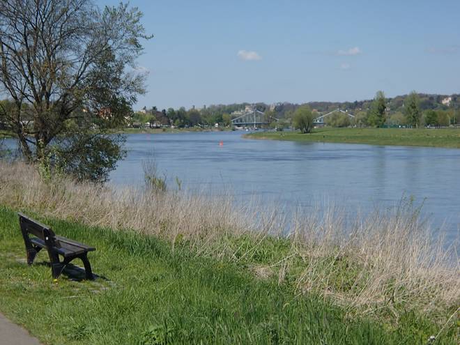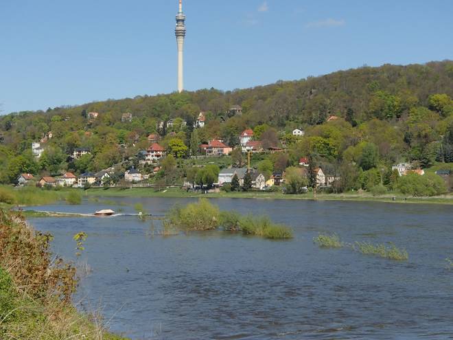 Laubegaster Ufer 12.41 Uhr / Km 30,9 Den Fernsehturm Dresden konnten wir schon eine ganze Weile sehen. Aber bis ins Zentrum von Dresden war es immer noch weit. |
