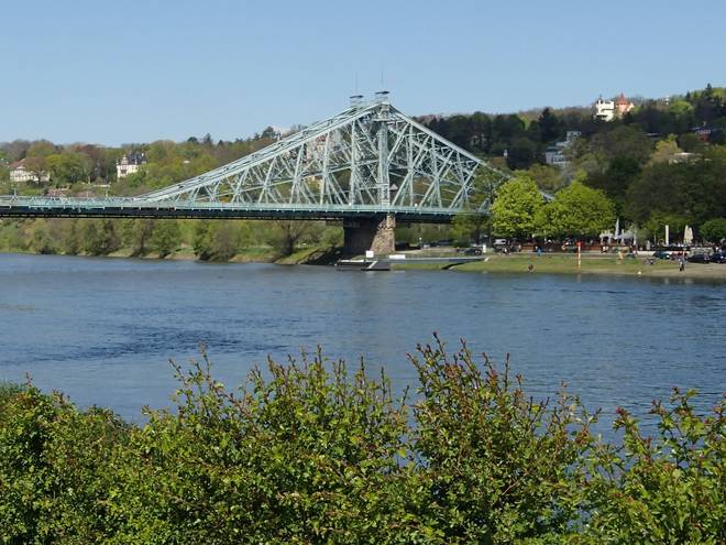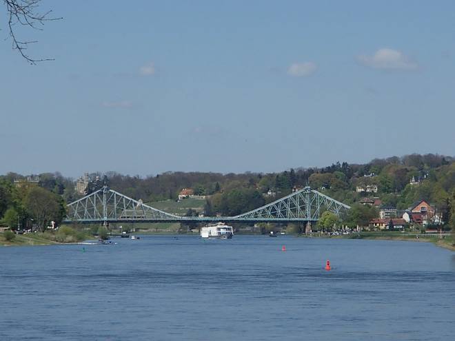 Tolkewitz/Laubegast 12.52 Uhr / Km 32,7 Noch zweieinhalb Kilometer entfernt, aber schon zum ersten Mal zu sehen: Die Loschwitzer Brücke, bekannter unter dem Namen "Blaues Wunder".