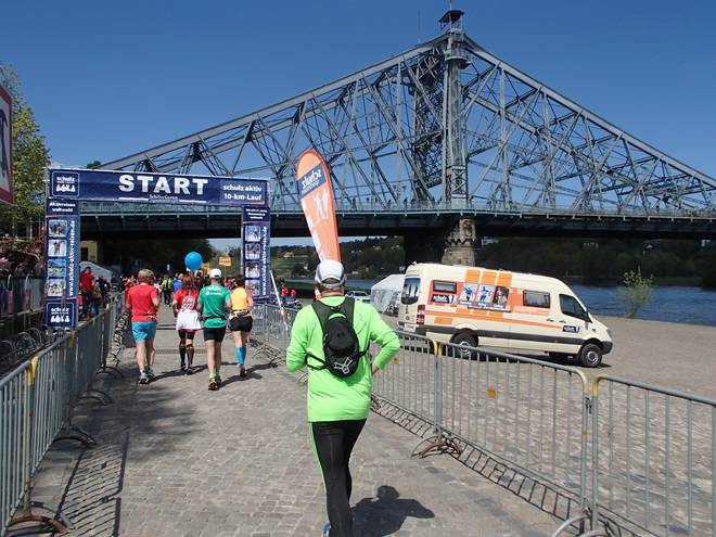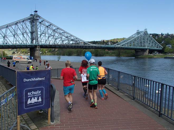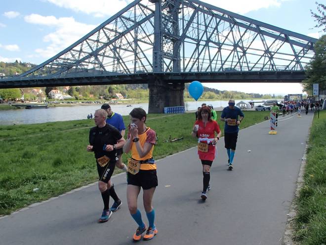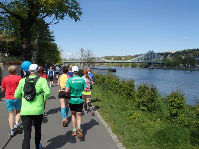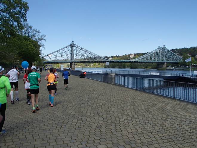 Blasewitz 12.59 Uhr / Km 34,0 Sollte ich an der Gruppe vorbei laufen oder dahinter bleiben? Das war keine renntaktische Frage, sondern es ging schon einmal um gute Fotos von der Brücke. Probleme kann man sich auch machen. |