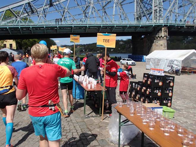 Elberadweg 13.05 Uhr / Km 35,0 Kurz vor der Brücke wieder ein Verpflegungsstand. Wasser, Tee, Cola, Obst, Iso, Iso. Ich persönlich würde ja das Wasser hinter das Obst setzen. Dann kann man sich den Kleb-Kram abwaschen. Könnte aber sein, daß genau das der Grund es, warum die Reihenfolge anders ist. Das Wasser ist ja zum Trinken da. |