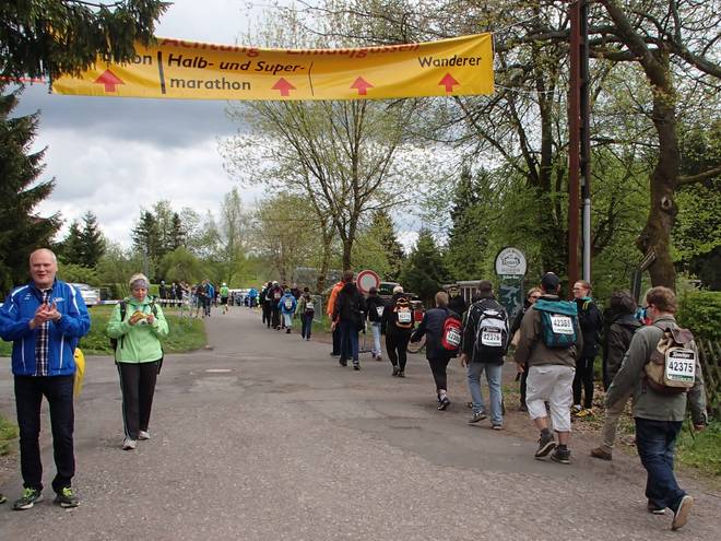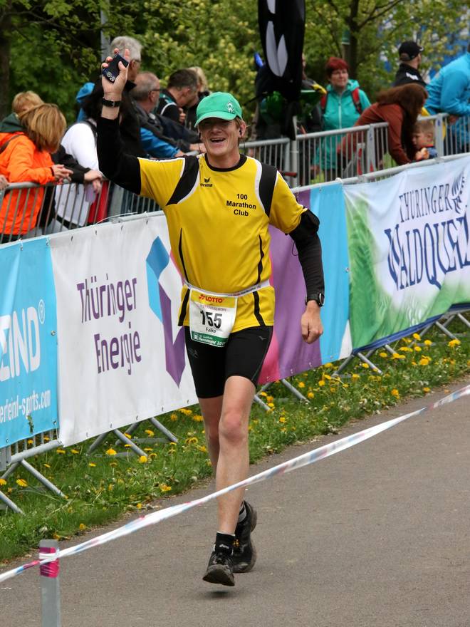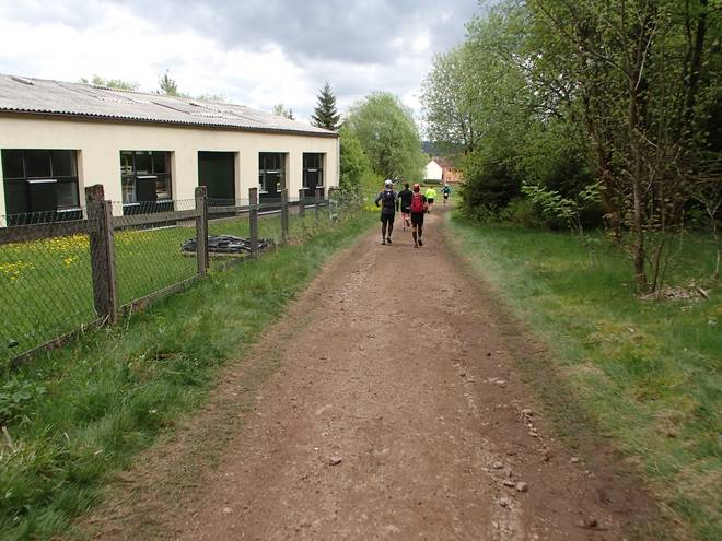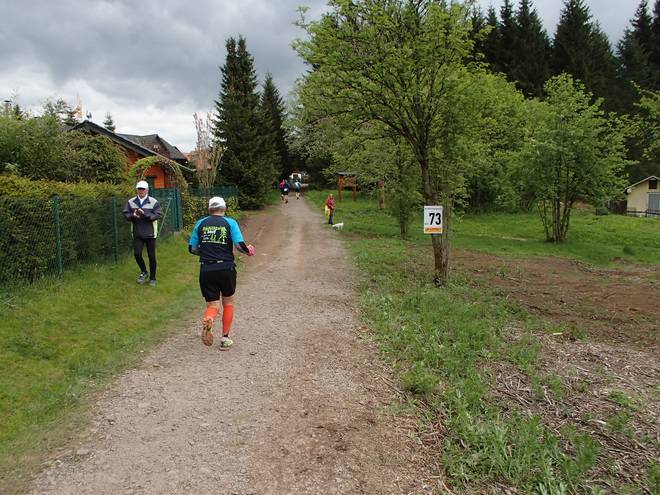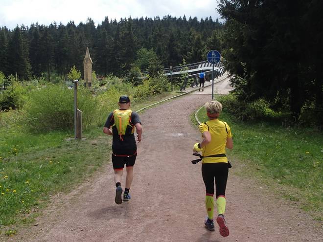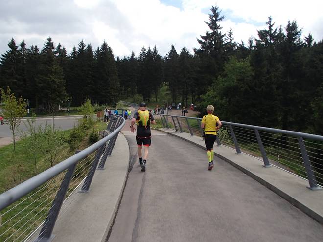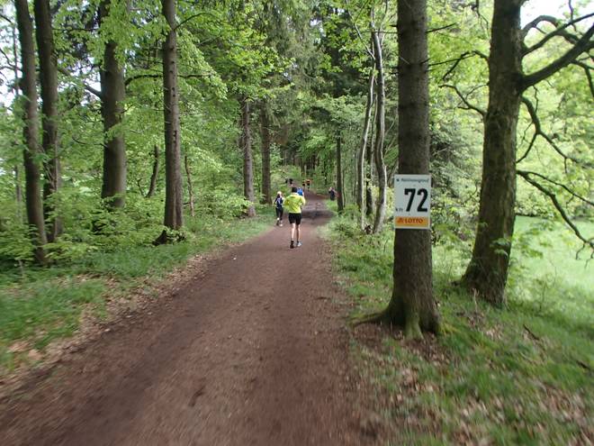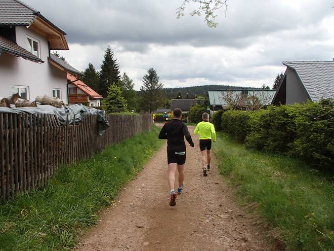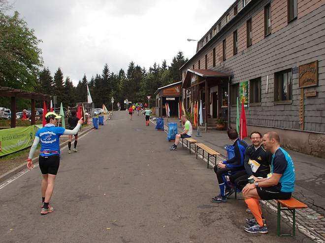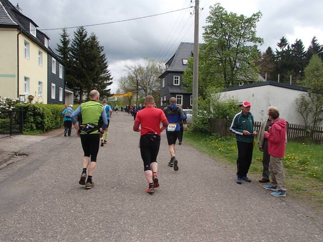 Schmiedefeld 14.42 Uhr / Km 73,3 Mit 4:56 Min/Km war ich ab Kilometer 70 in Richtung Schmiedefeld gerannt. Nun nahm ich aber doch ein wenig Tempo raus und wollte den Rest genießen. |