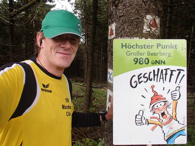 Großer Beerberg 13.33 Uhr / Km 62,3 Offenbar hatte man nicht nur die Strecke neu vermessen. 2012 stand auf dem Schild am Großen Beerberg nur 974 Meter als höchster Punkt der Strecke. Foto: Foto-Team-Müller |