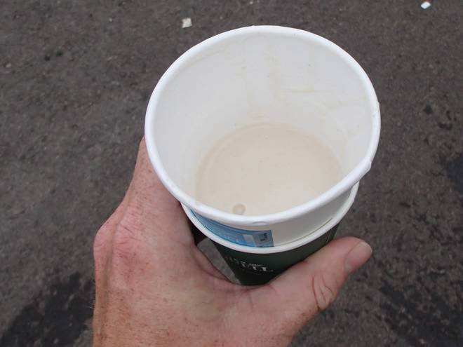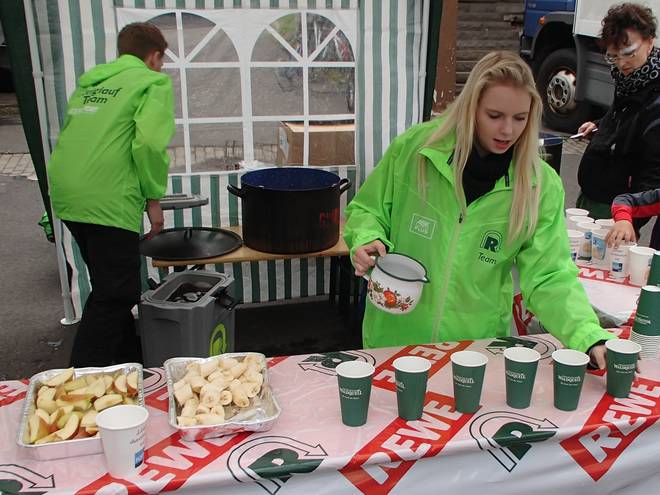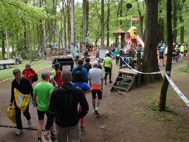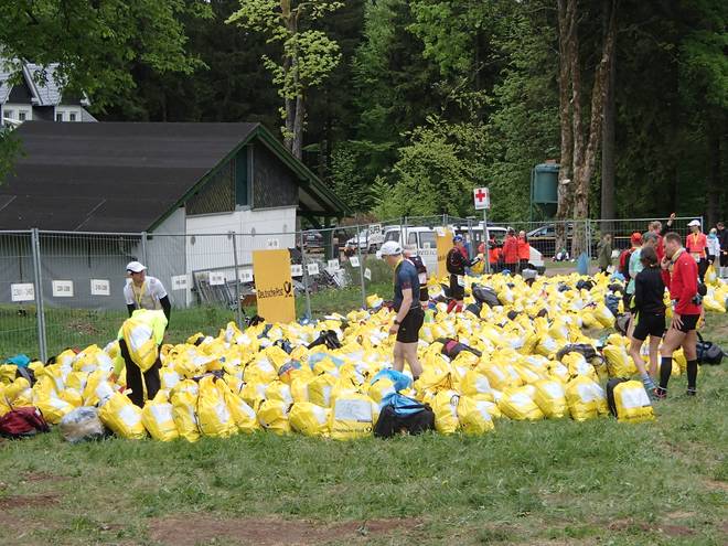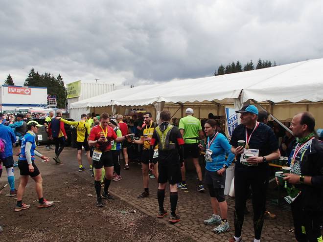 Schmücke 13.50 Uhr / Km 64,8 Ziemlich warmer Schleim. Da mußte ein zweiter Becher ran. Inklusive der Getränke gingen alleine für mich also fünf der Becher drauf. Nicht wirklich nachhaltig, aber kurz vor acht Stunden arbeitet das Hirn nicht mehr umweltfreundlich. |