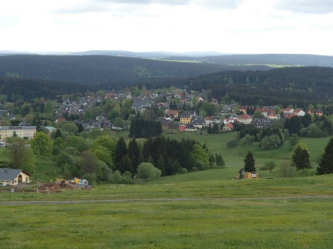 Eisenberglift 14.27 Uhr / Km 70,7 Das war der erste Blick auf Schmiedefeld. Sah nah aus, aber wir liefen in großem Bogen hinein. |