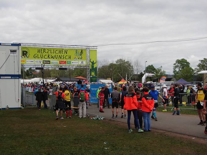 Schmiedefeld 14.44 Uhr / Km 73,5 Glücklich wankte ich durch den Zielraum. Mir ging es soweit gut. Nur beim Stehen bleiben taten die Beine weh. |