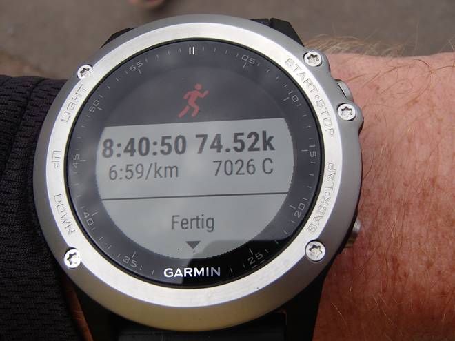 Schmiedefeld 14.47 Uhr / Km 73,5 Ja, was war das denn? Okay, die tatsächlich Zeit betrug nur 8:40:39 Stunden und die Strecke 73,5 Kilometer. Aber die 6:59 Min/Km sahen doch Weltklasse aus. Tatsächlich waren es 7:05 Min/ Km. |