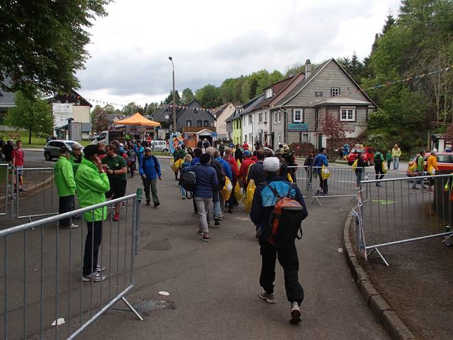 Schmiedefeld 14.41 Uhr / Km 73,2 Und schon ging es ins (nach Veranstalterangabe) schönste Ziel der Welt. Rechte Seite noch Nordic Walker am Ende der 17 Kilometer von Oberhof nach Schmiedefeld. |
