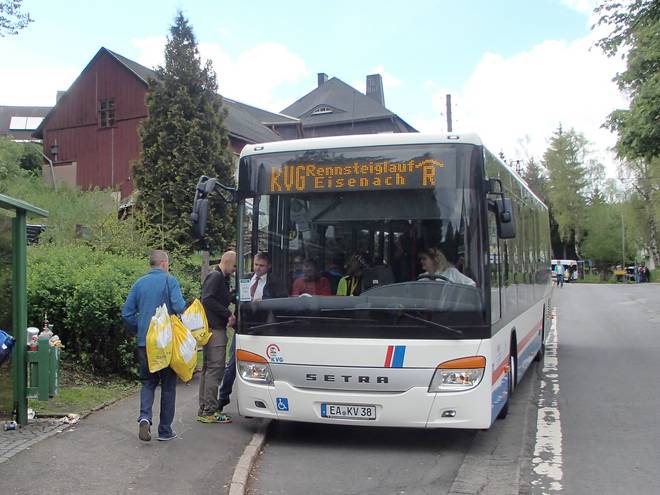 Schmiedefeld 15.43 Uhr Der finale Akt ist dann die Busfahrt zurück nach Eisenach. Toller Service, aber auch hier muß man leiden. Die Abfahrt ist etliche Höhenmeter unter der Partywiese am Ziel. Der Weg die steile Straße runter ist eine Toutour. |